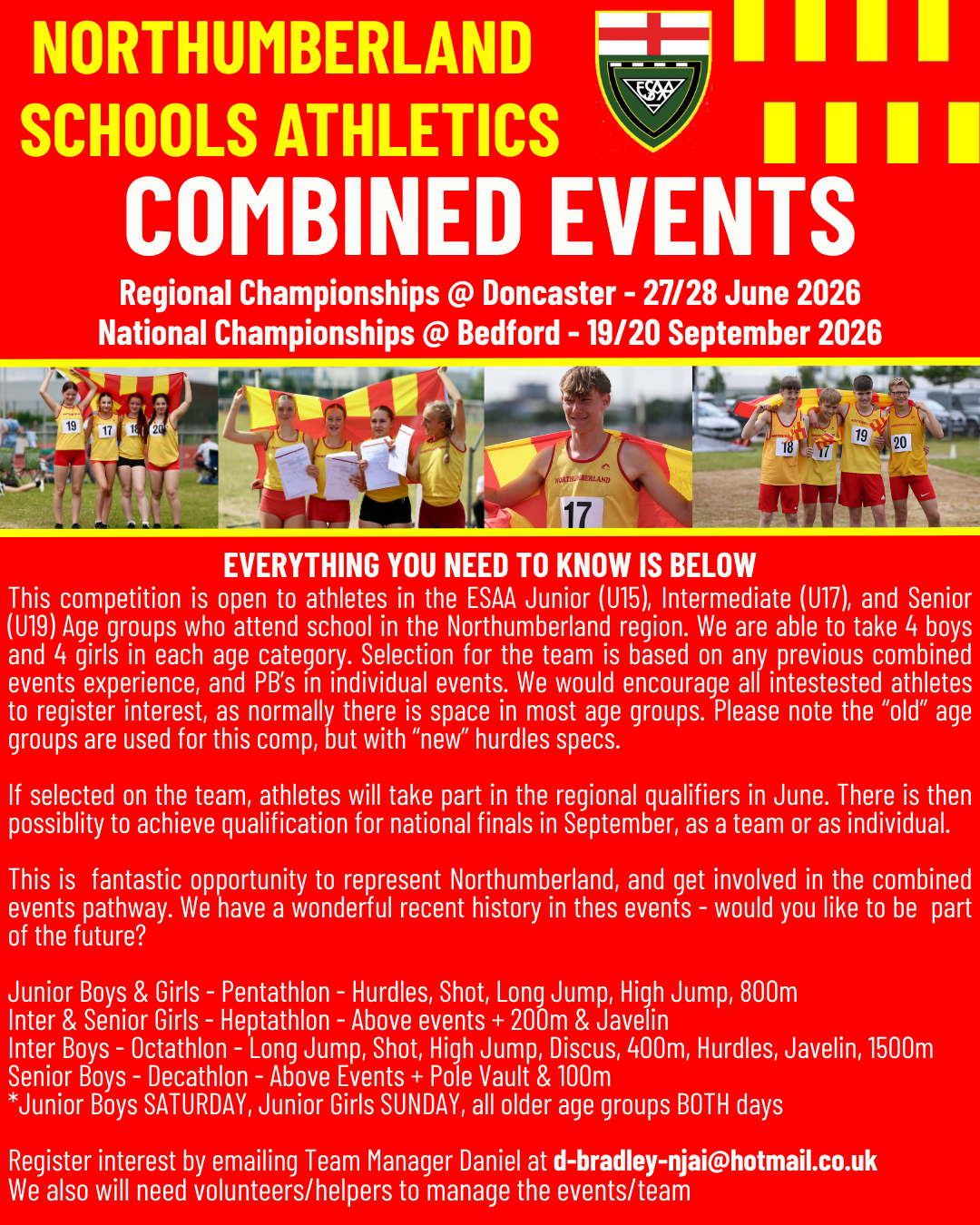 RUN-HURDLE-JUMP-THROW FOR A FANTASTIC ATHLETIC EXPERIENCE COME AND JOIN NORTHUMBERLAND SCHOOLS COMBINED EVENTS SQUAD AND BE PART OF A GREAT TEAM please click HERE for this year's Hurdles' specs